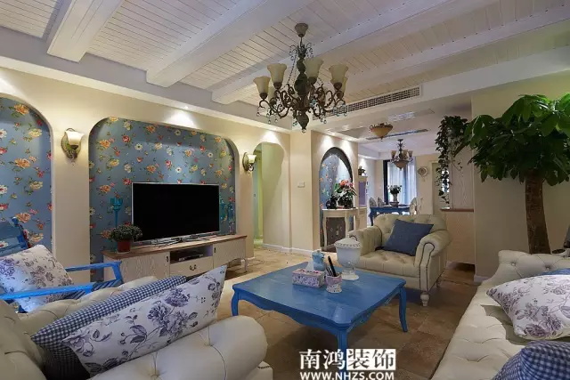 地中海風(fēng)格中的茶幾,和木紋飾面的沙發(fā)相映成趣,中空處擺上盆栽,仿佛成了一個(gè)小展館。
